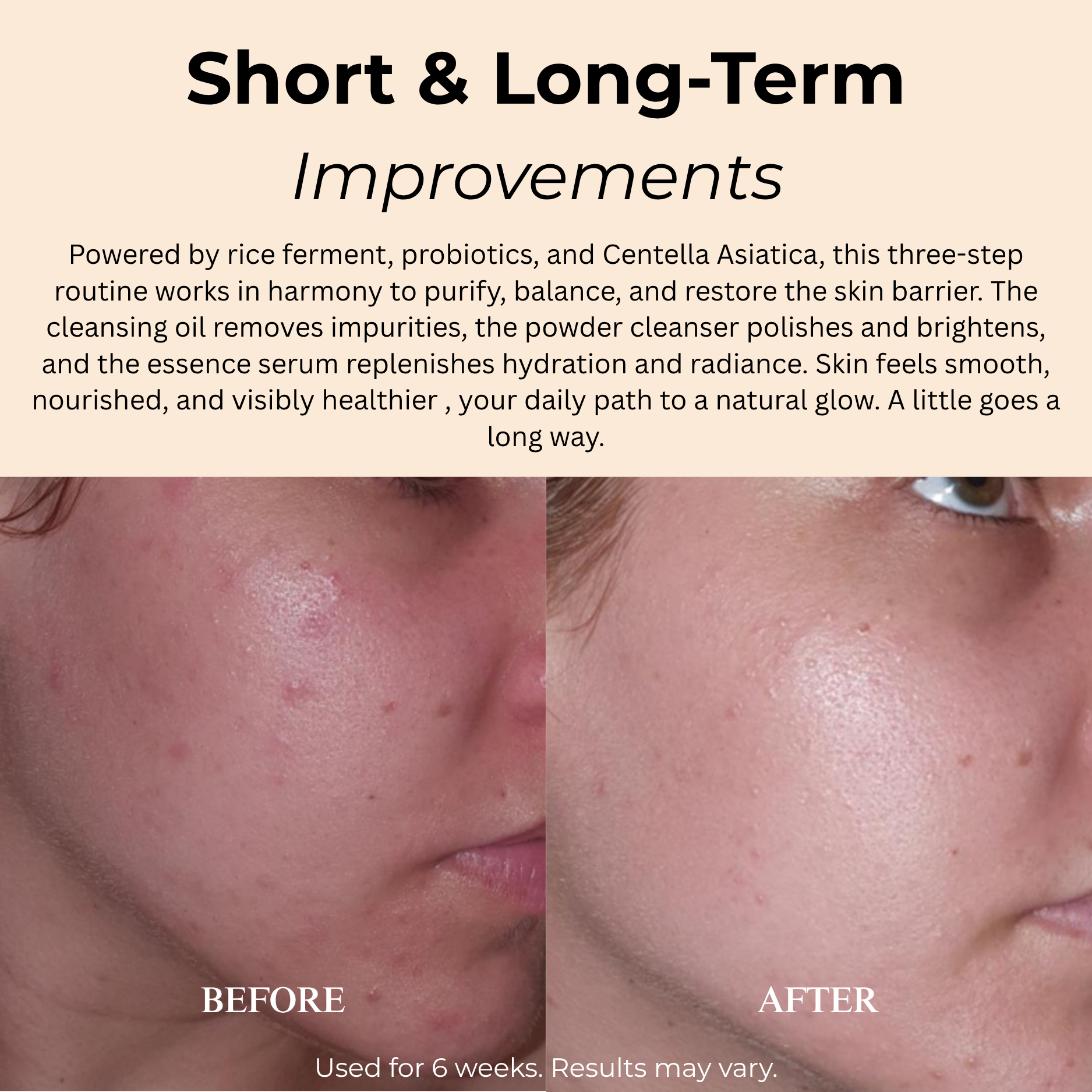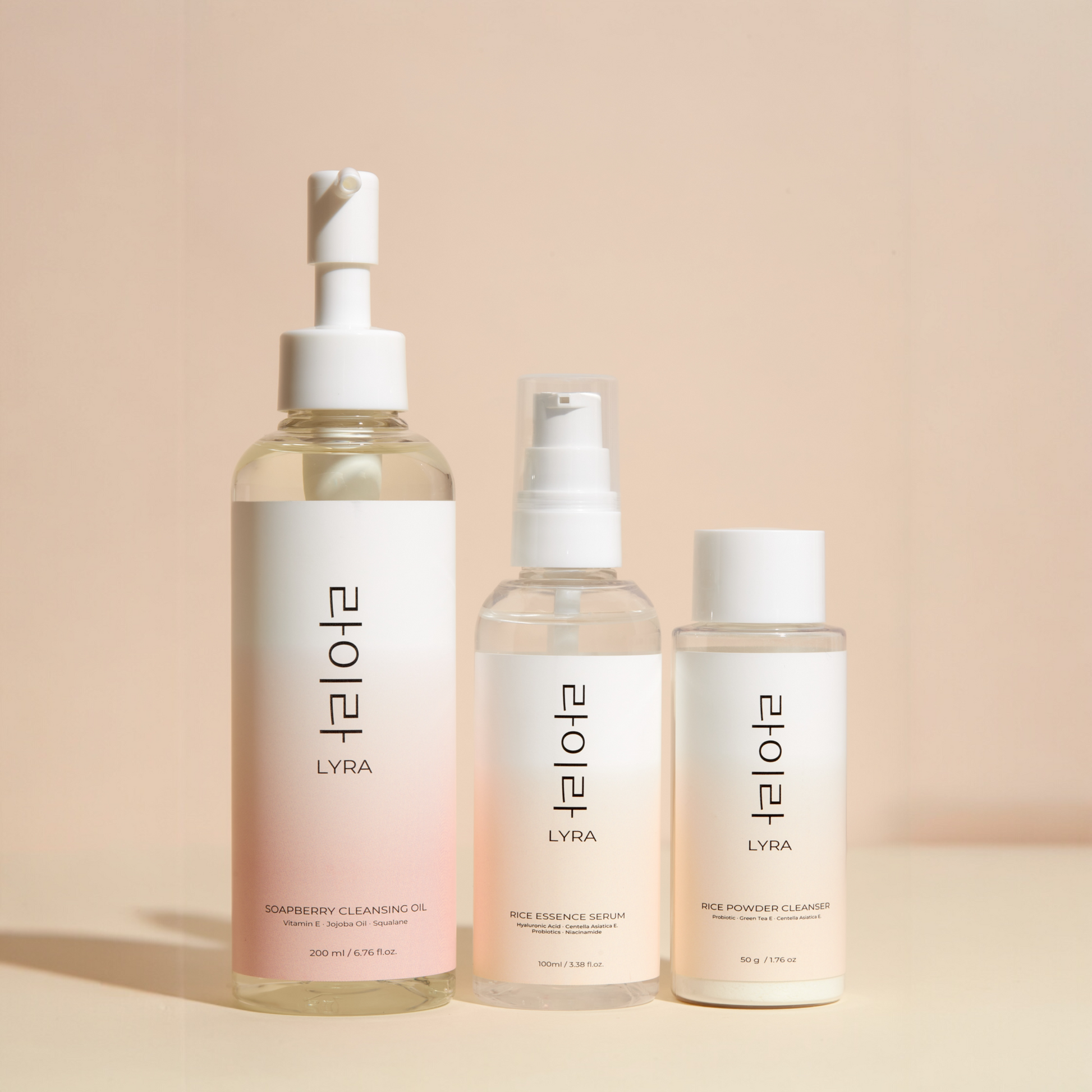 Cleanse, Hydrate & Glow A 3-step routine for radiant skin. Melt away impurities with Soapberry Cleansing Oil, gently exfoliate with Rice Powder Cleanser, and nourish with Rice Essence Serum for a hydrated, glowing complexion.